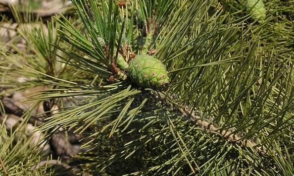 成樹的葉 (松針)長3至5厘米,藍(lán)綠色,成對出現(xiàn)。幼樹針長是成樹的兩倍,且在粗壯的芽尖上以三至四支一組出現(xiàn)。球果長3至7厘米,呈尖卵形。