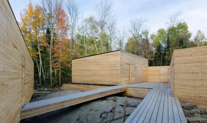 肯尼迪住宅坐落于加拿大一處偏遠(yuǎn)湖泊岸邊的基層巖之上,該建筑以松木為表皮,設(shè)計(jì)構(gòu)思來(lái)源于飄在水面上的浮木。三居室住宅、碼頭客棧、車庫(kù)和一座用墻圍起來(lái)的菜圃通過(guò)一系列的木質(zhì)走廊和平臺(tái)連接起來(lái)。在兩個(gè)預(yù)制模塊體量之間的相交處,Kennedy住宅的線性形式仿佛僅通過(guò)樹皮維進(jìn)而緊緊地咬合在一起。交接處的開(kāi)放式間隔形成了一個(gè)面向湖水的V型的室外空間。