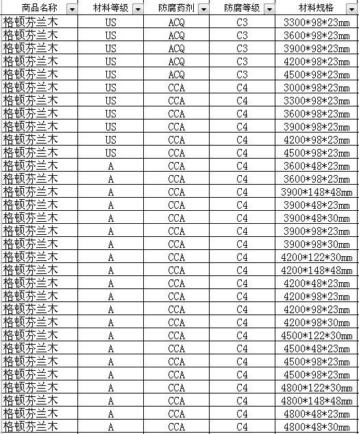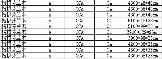 注:1、上述所有木材長度范圍為3300—5400MM,每300mm為一個(gè)進(jìn)級(jí)。 (即長度3300 /3600 /3900 /4200 /4500 /4800 /5100 /5400MM) 2、訂貨請(qǐng)按倉庫現(xiàn)有規(guī)格及長度配貨,具體請(qǐng)聯(lián)系本公司芬蘭防腐木銷售部。