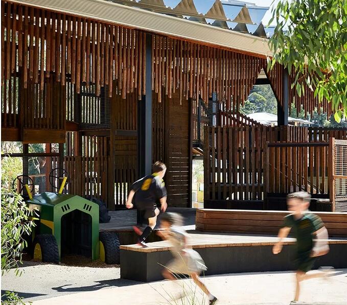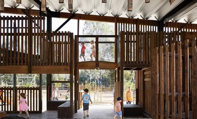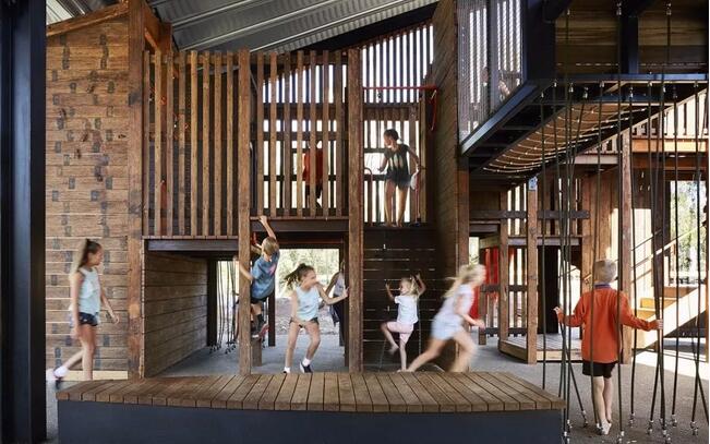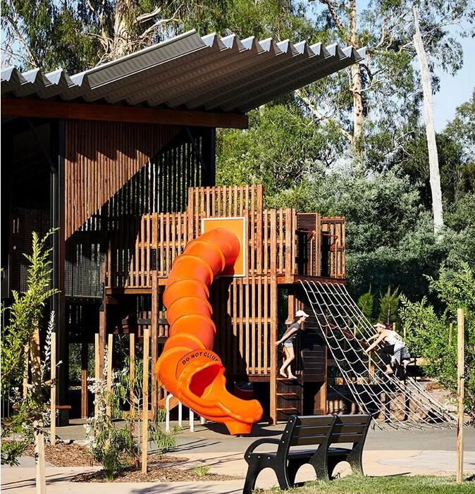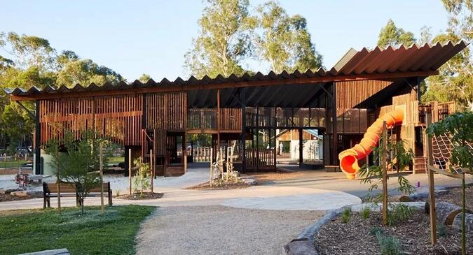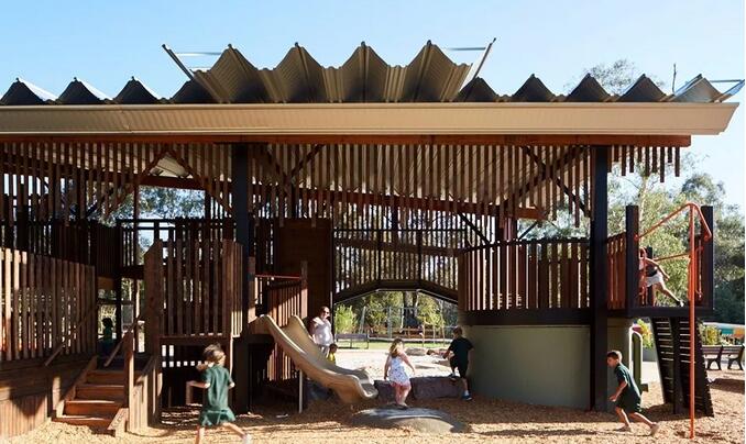 整個(gè)游樂(lè)場(chǎng)由防腐木結(jié)構(gòu)和外面用來(lái)遮罩防雨的鋼結(jié)構(gòu)頂組成。將不同的活動(dòng)要素整合在一個(gè)結(jié)構(gòu)當(dāng)中。新的游樂(lè)場(chǎng)被移動(dòng)到了靠近溪流的位置,周圍環(huán)繞著高大的桉樹。設(shè)計(jì)的核心思路是打造一個(gè)大型的有頂游樂(lè)場(chǎng),使其可以在任何天氣下使用。以木結(jié)構(gòu)支撐的寬闊屋頂為整個(gè)游戲場(chǎng)地提供了基本的框架。最終落成的游樂(lè)場(chǎng)看上去就像是一個(gè)舊時(shí)的剪毛棚,喚起了人們?cè)?jīng)在舊谷倉(cāng)里玩耍的記憶:冒險(xiǎn)的氣息,熟悉的氣味,以及爬上爬下和尋找安靜角落的有趣體驗(yàn)。寬闊屋頂?shù)奈蓓斒褂螛?lè)場(chǎng)可以在任何天氣下使用。
