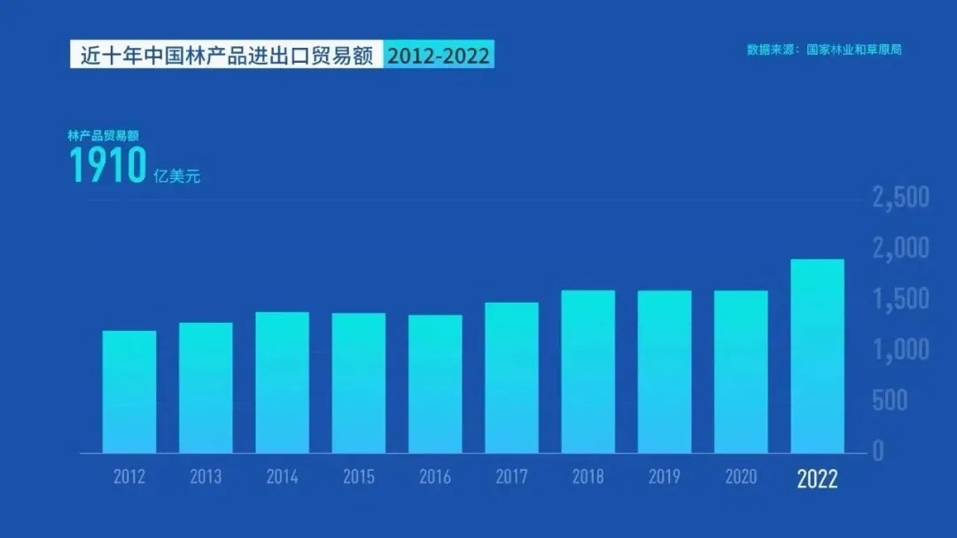 黨的十八大以來,中國林業(yè)產(chǎn)業(yè)總產(chǎn)值由2012年的3.95萬億元增長到2022年的8.37萬億元,產(chǎn)業(yè)規(guī)模翻了1倍多。林產(chǎn)品進出口貿(mào)易額由2012年的1206.39億美元增長到2022年的1910億美元,貿(mào)易規(guī)模擴大了1.5倍。