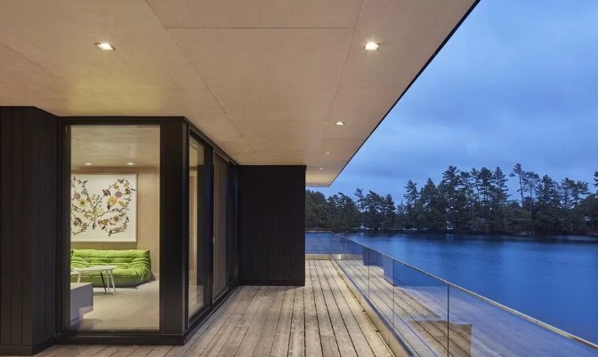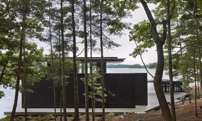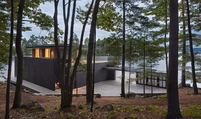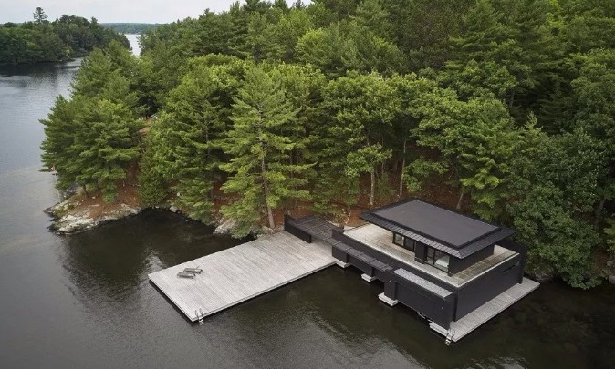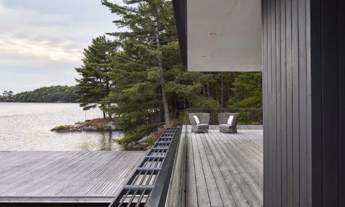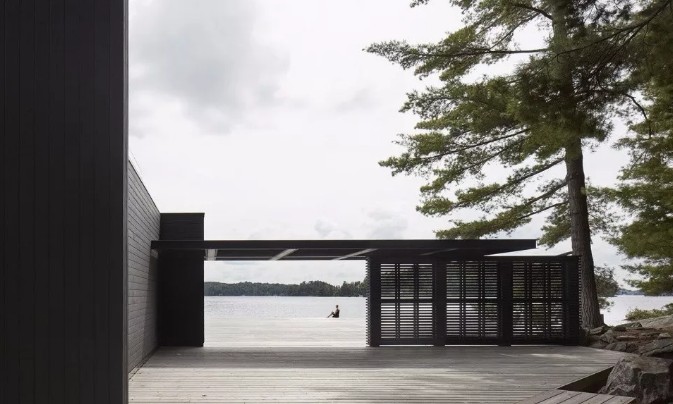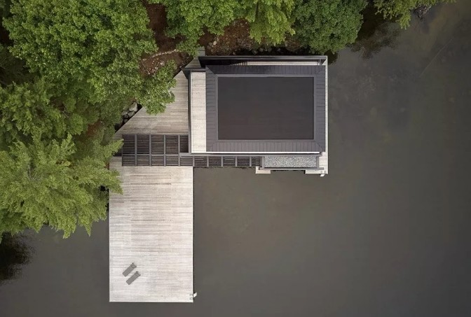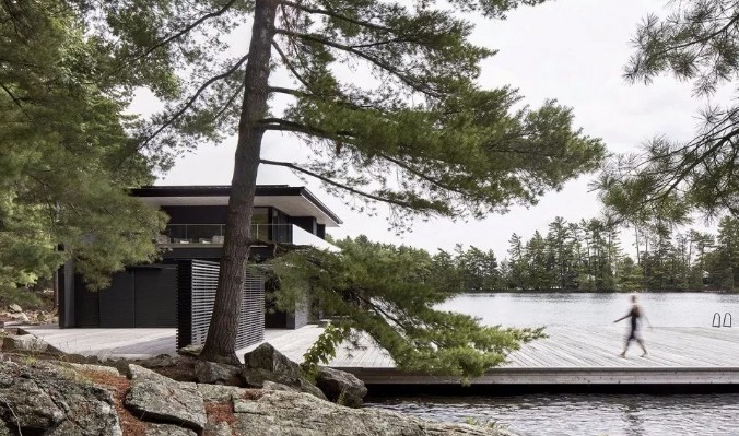 湖邊常見的木制碼頭,常常由木板和隱藏于板下的支柱構(gòu)成,形成一個(gè)方便人們行走的平臺(tái)。加拿大建筑師以此為靈感,設(shè)計(jì)出這個(gè)長(zhǎng)方形體量的臨水住宅。從遠(yuǎn)處望去,該住宅就像是一系列相互錯(cuò)開的二維平面,各個(gè)平面之間的交接線與水流的方向相與冥合,共筑出一個(gè)舒適的居住觀景平臺(tái)。