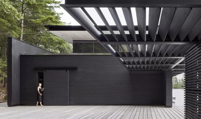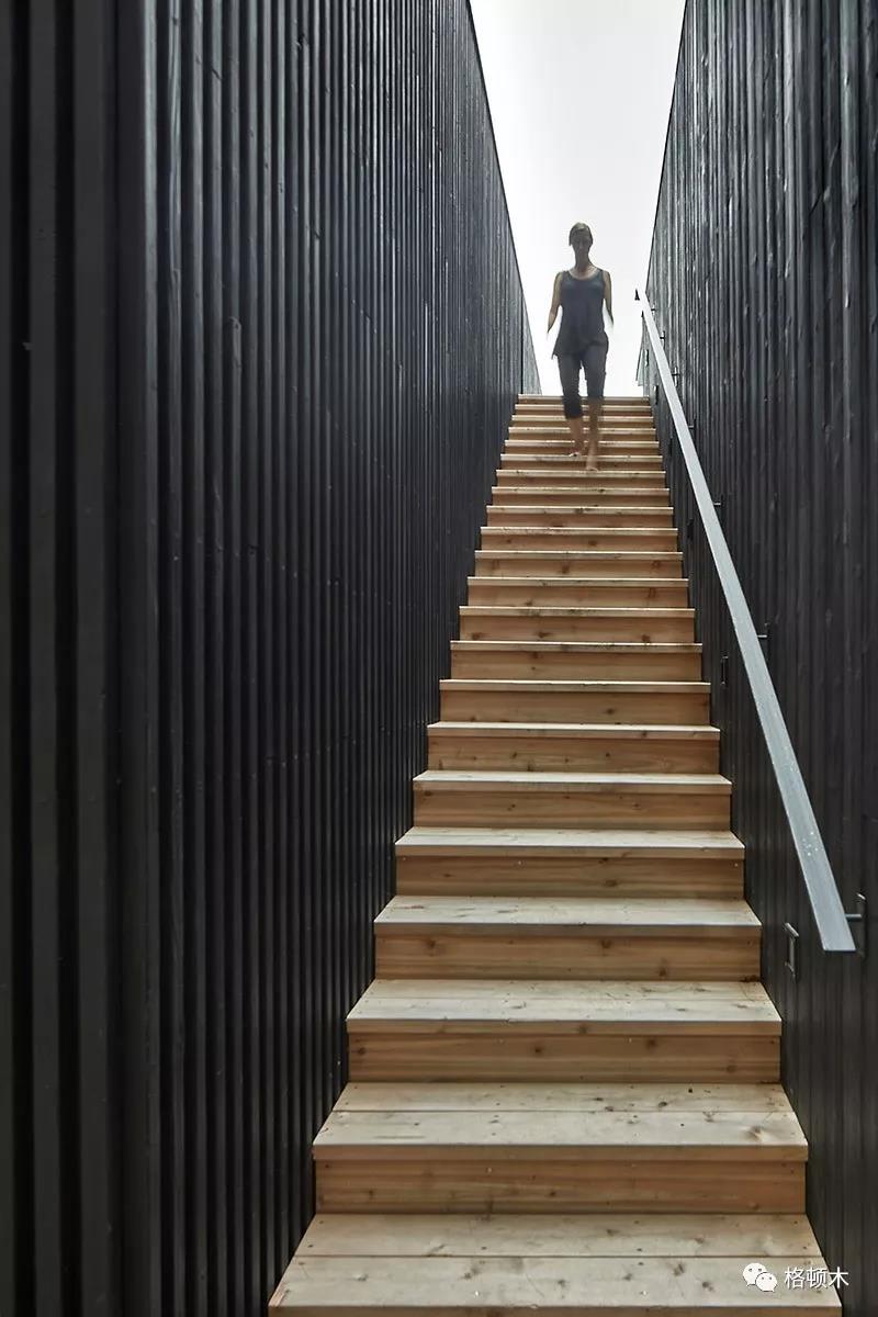 平臺(tái)住宅選擇松木作為外墻材料,墻板經(jīng)過日本燒杉板制作工藝(炭化工藝)處理,可以最大限度地抵抗自然風(fēng)化的侵襲,美觀的同時(shí)降低了外圍護(hù)結(jié)構(gòu)的維護(hù)成本。一系列水平和豎直的板材將各個(gè)二維的平面區(qū)分開來。
